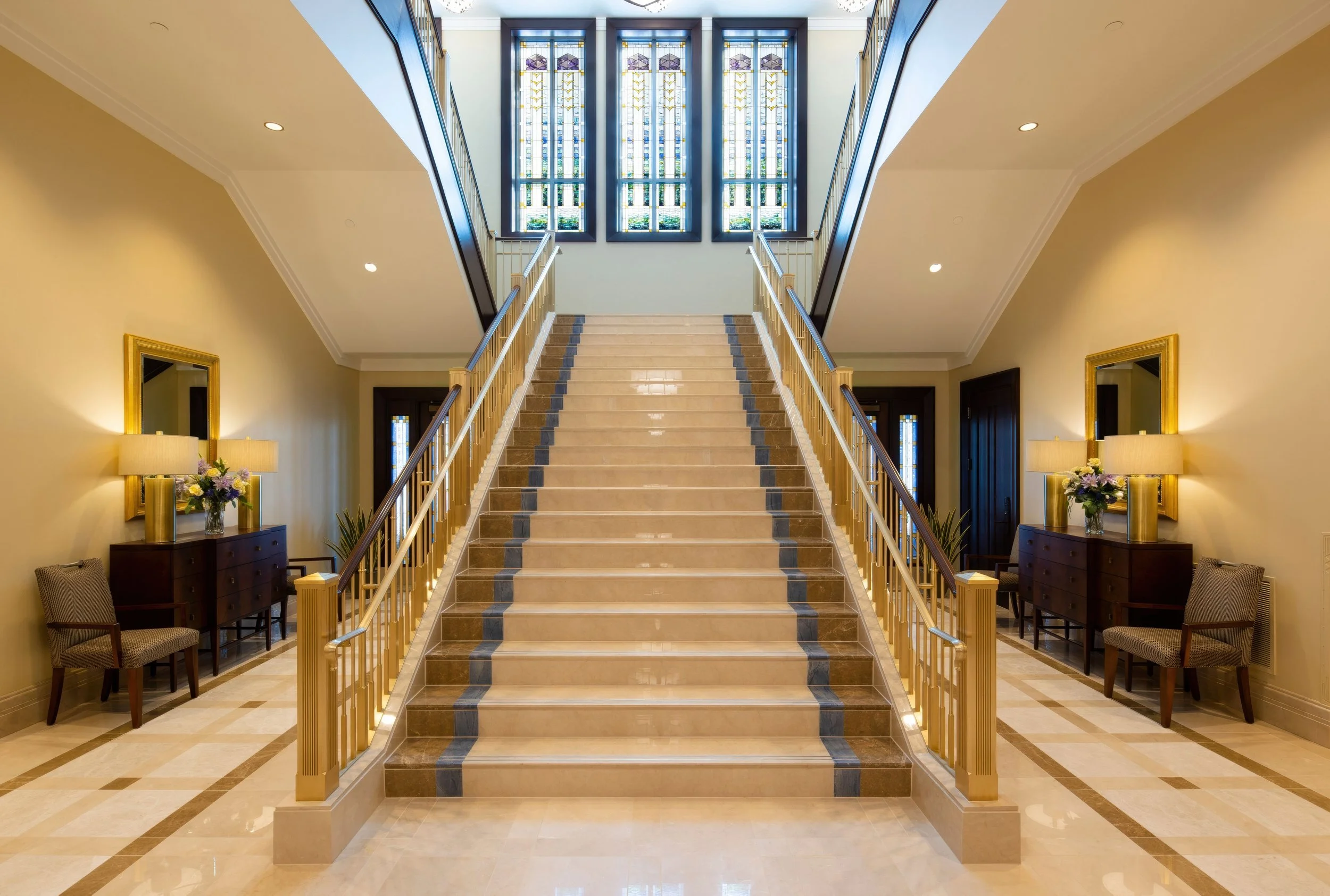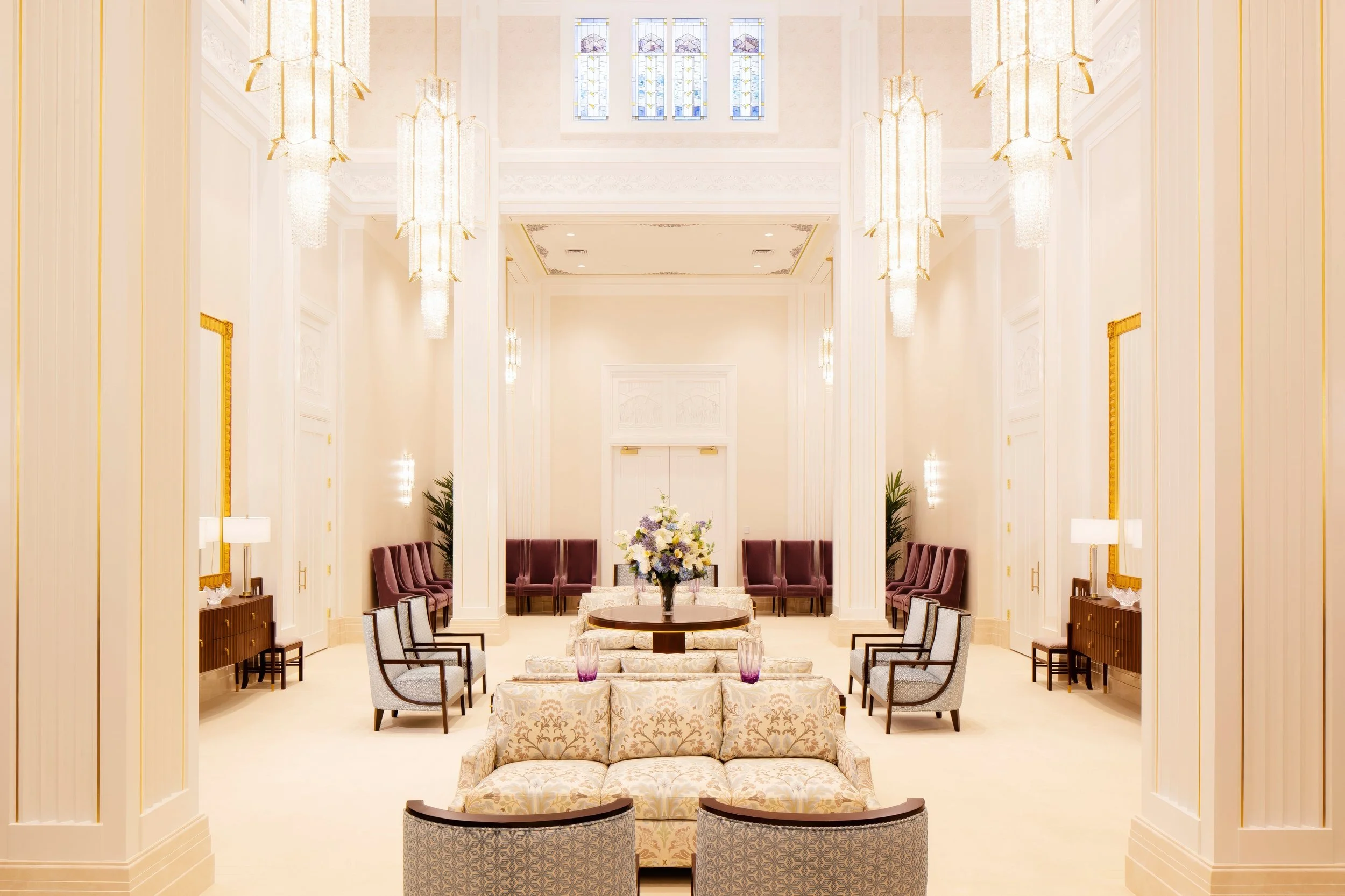 The flooring is a combination of carpet, area rugs, porcelain tile, ceramic tile, glass tile and stone. The carpet patterns are carved on-site, and the carved patterns were designed by the architectural team and Gregg Johnson of Halfmoon Studio, located in Salt Lake City, Utah. Custom rugs in the bride’s room, entry and patron waiting areas were manufactured by Rugs International, headquartered in the United States, and manufactured in Guangdong, China.