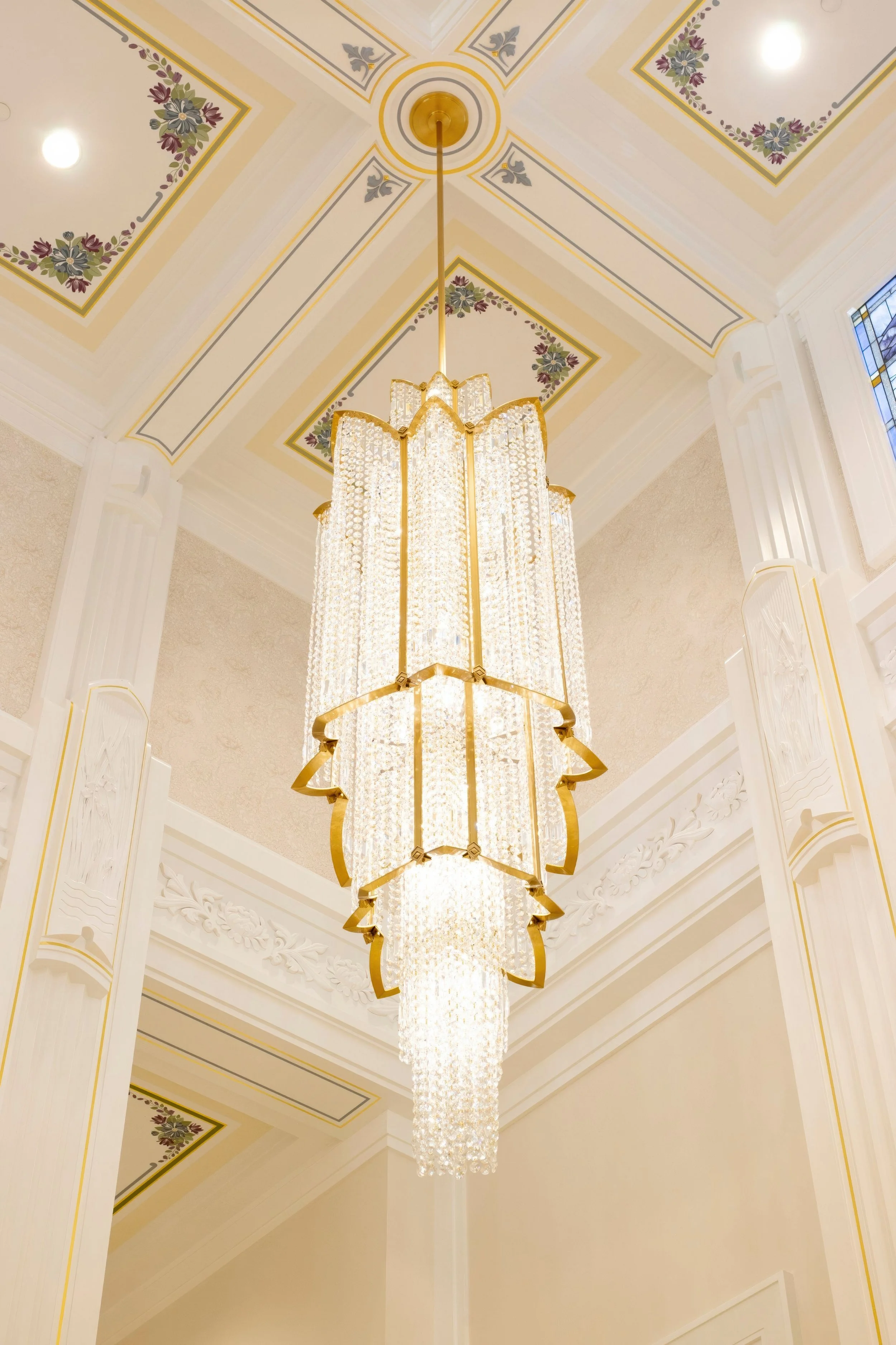 The majority of the ceilings are painted gypsum. There are locations that have stepped ceilings to enhance the architecture in the space. Custom ceiling medallions featuring floral and foliage embellishments, manufactured with Allen’s Commercial Arts, are found throughout the temple.